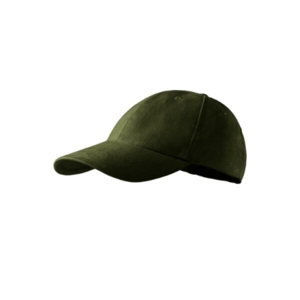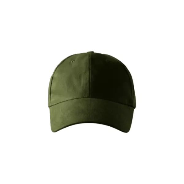 zes-paneel ontwerp , 2 voorpanelen gelijmd , gestikte ronde klep , geborduurde luchtgaten , zweetband , maat verstelbaar door klitteband